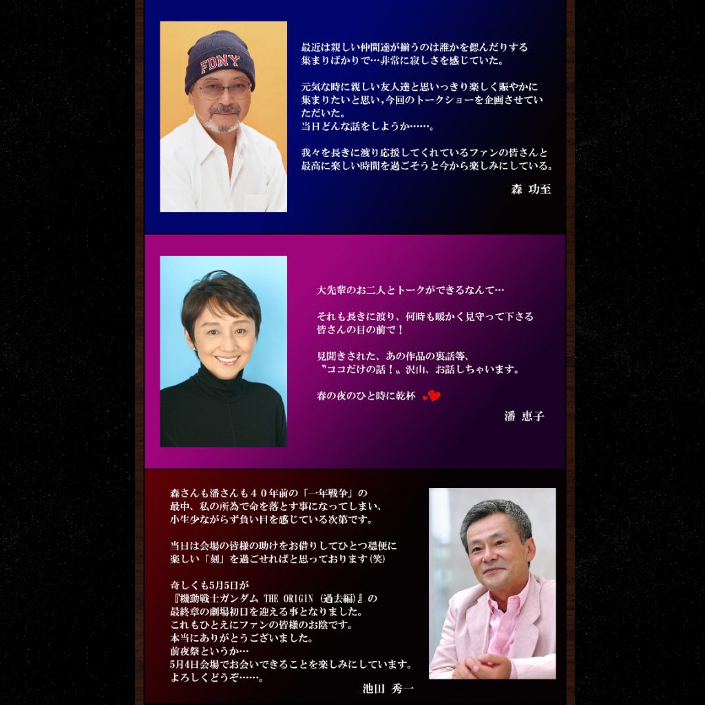 レジェンド声優 森功至さん・潘恵子さん・池田秀一さんによるトークショーが5月4日開催!
